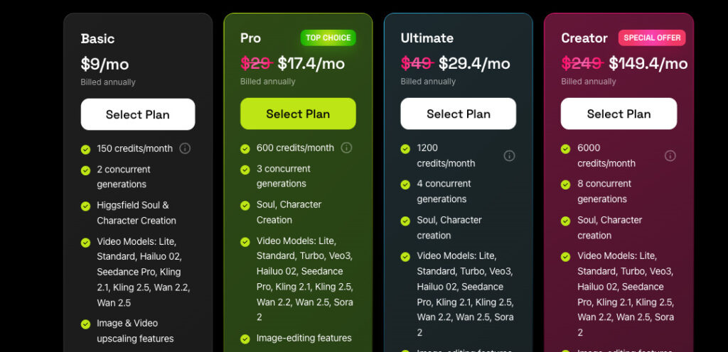 そこでおすすめしたいのが、月額が約7,000円で無制限利用が可能な動画生成AI『Higgsfield』。