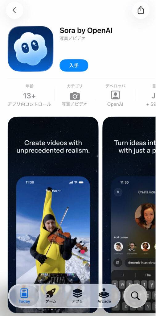 また、SNSアプリの「Sora」はSora2の動画生成に加え、Cameo機能(自分の顔を他の動画に合成)やリミックス機能(他人の動画を再編集)などが楽しめます。