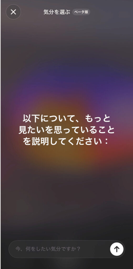 「Sora」では好みに合わせて流れてくる動画のジャンルを設定することも可能です。タイムラインの「あなたへのおすすめ」から「気分を選ぶ」で入力欄が出てきます。こちらも日本語に対応しているため、「動物」や「日本人」のように設定して他の方が生成した動画もぜひ見てみてくださいね。