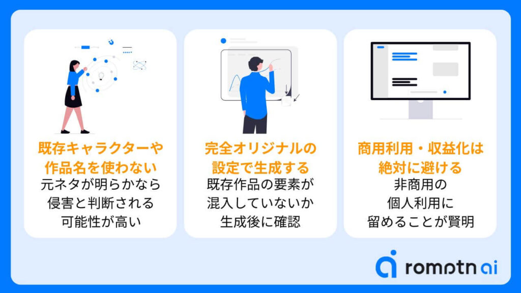 完全オリジナルの設定で生成する:自分で考えたキャラクター設定、世界観、ストーリーのみを使用しましょう。既存作品の要素が混入していないか、生成後に必ず確認することも大切です。