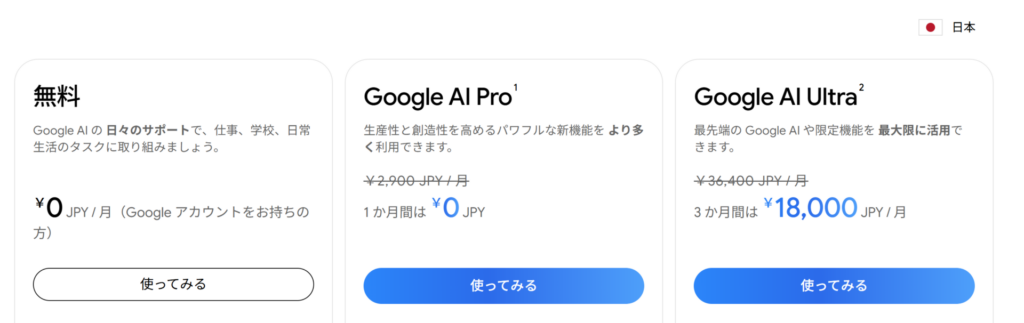 | 項目 | 無料プラン | Proプラン(Google AI Pro) | Ultraプラン(Google AI Ultra) |