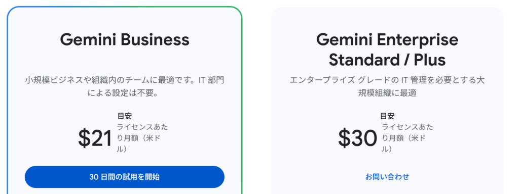 企業向けの「Gemini for Google Workspace」には企業向けプランの公式サイトから課金可能です。