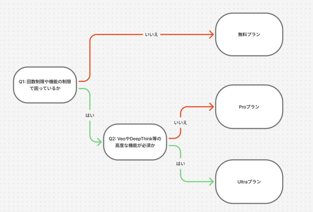 しかし、個人の利用状況や使いたい機能によって課金するべきかは変わってくるので、あなたがGeminiに課金するべきかどうかを最短で判断するための簡単なフローをご用意しました。