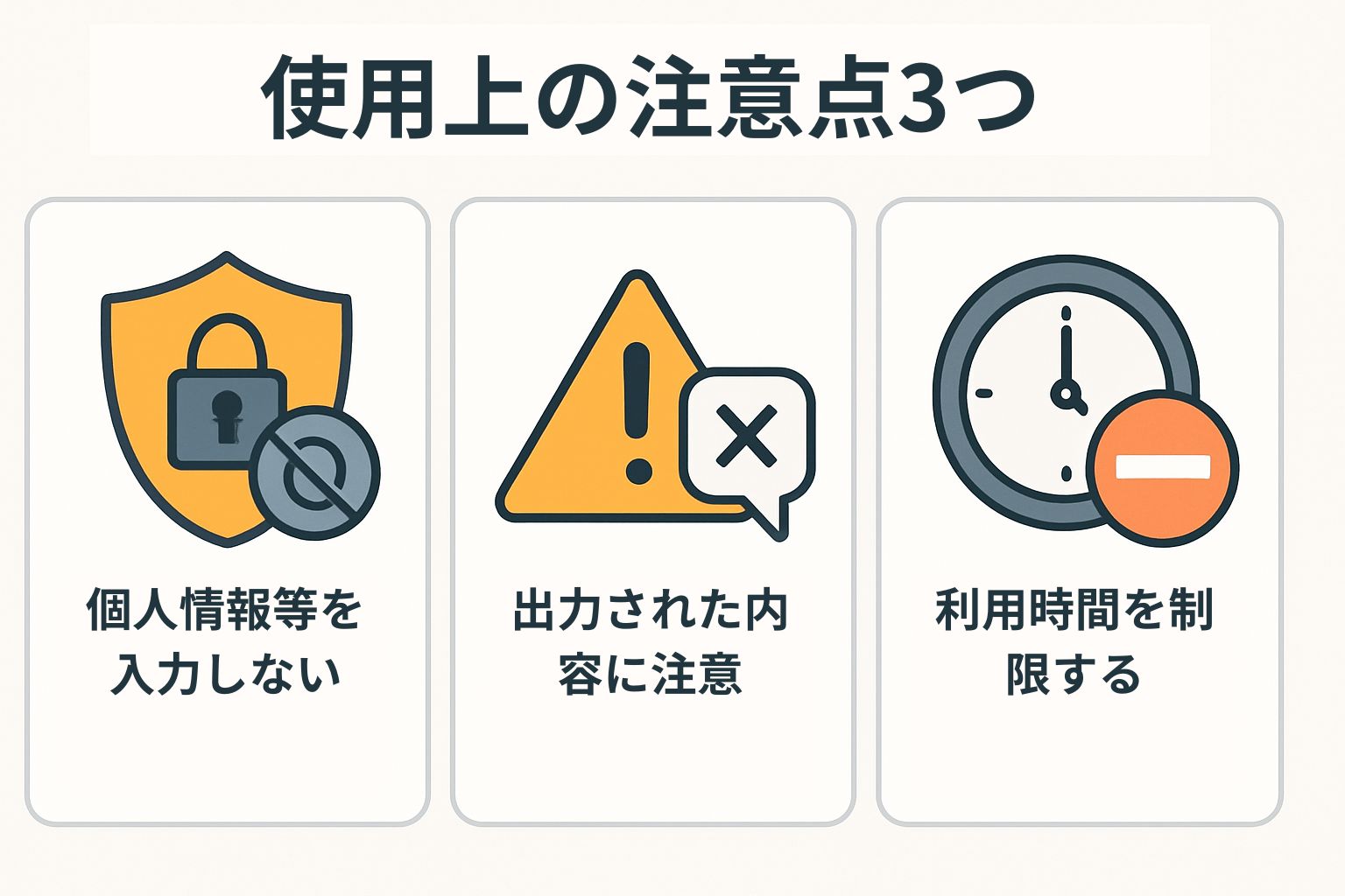 子どもがAIを安全に使うためには、次の基本的な3点を守ることが重要です。