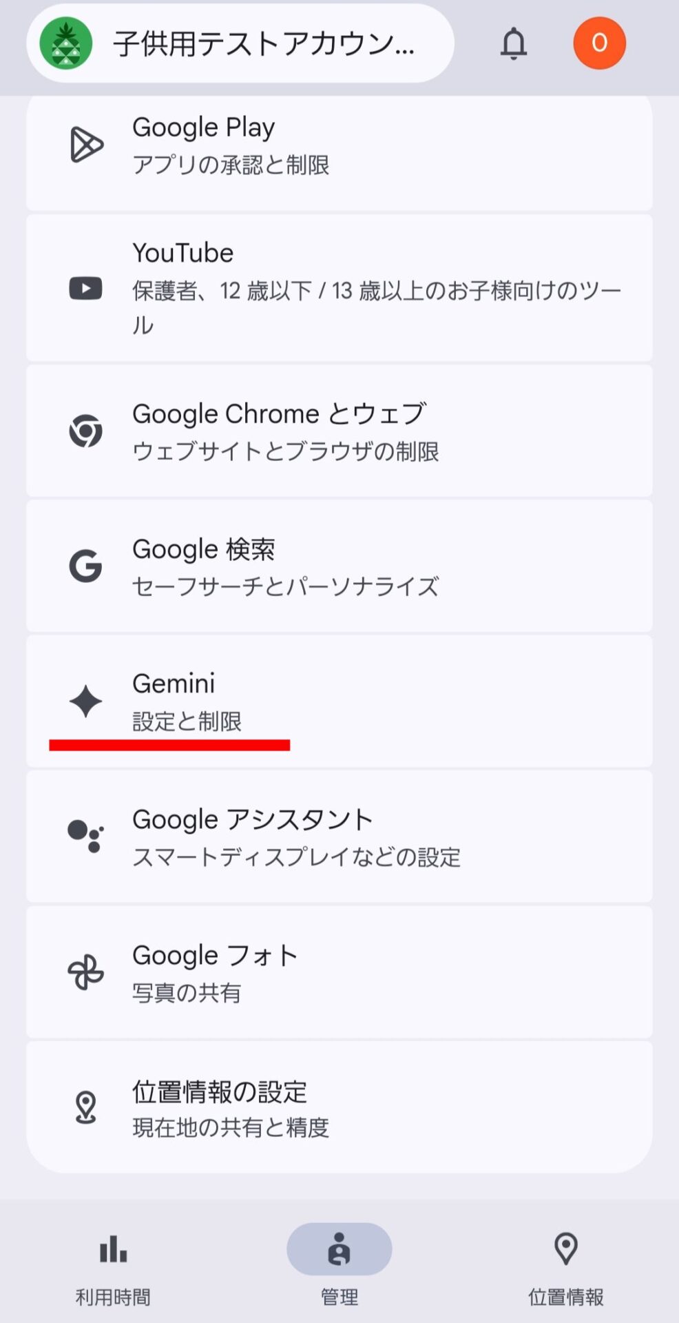 以下は、13 歳未満の子どもにGeminiの利用を許可するのか制限するのかの設定を行う方法です。