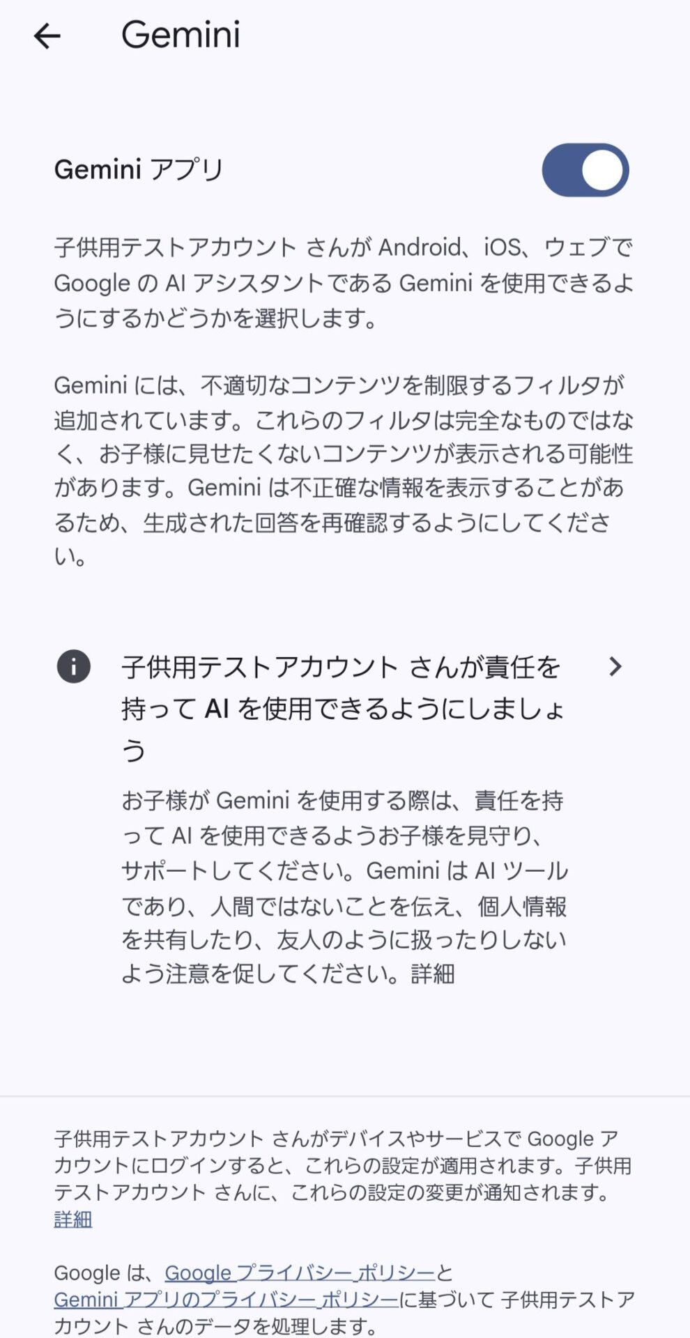 子どものGemini利用は保護者の管理下でオン/オフ設定でき、アクセス許可を親が制御できます。 - 追加フィルタリング/制限付き応答