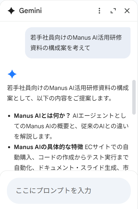 そのため実際には、Googleスライドを開きながら同画面内でGeminiとチャットできる、という部分のみが唯一のメリットといえます。現状では、その他の細かいスライド作成サポート機能はお試しで使ってみて、もし使えるものが生成できたら採用する、という使い方がおすすめです。