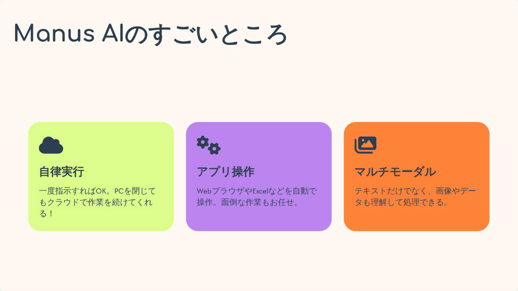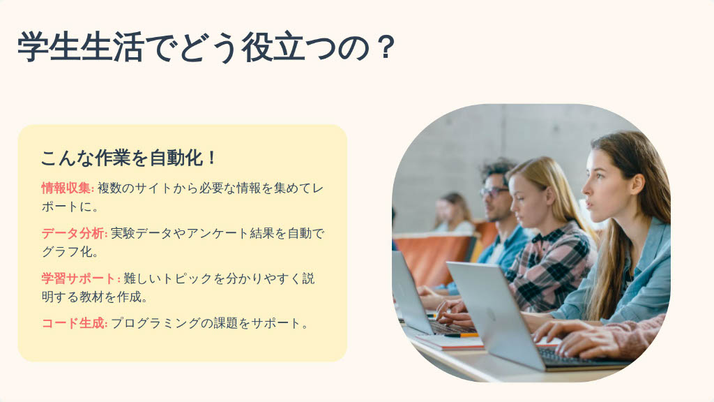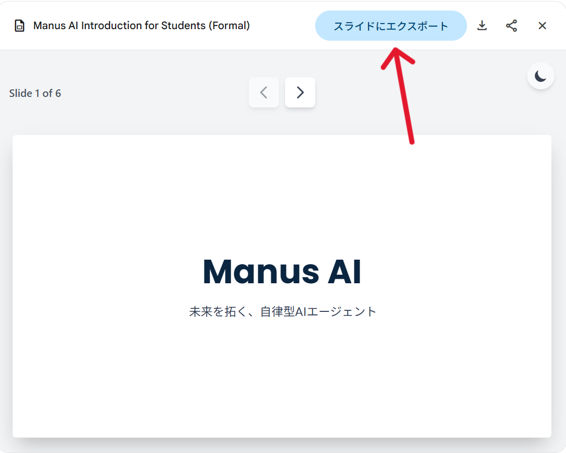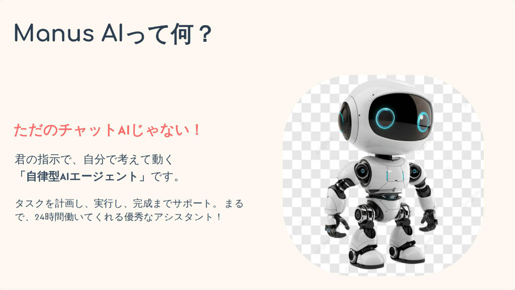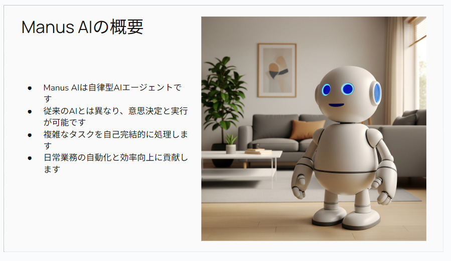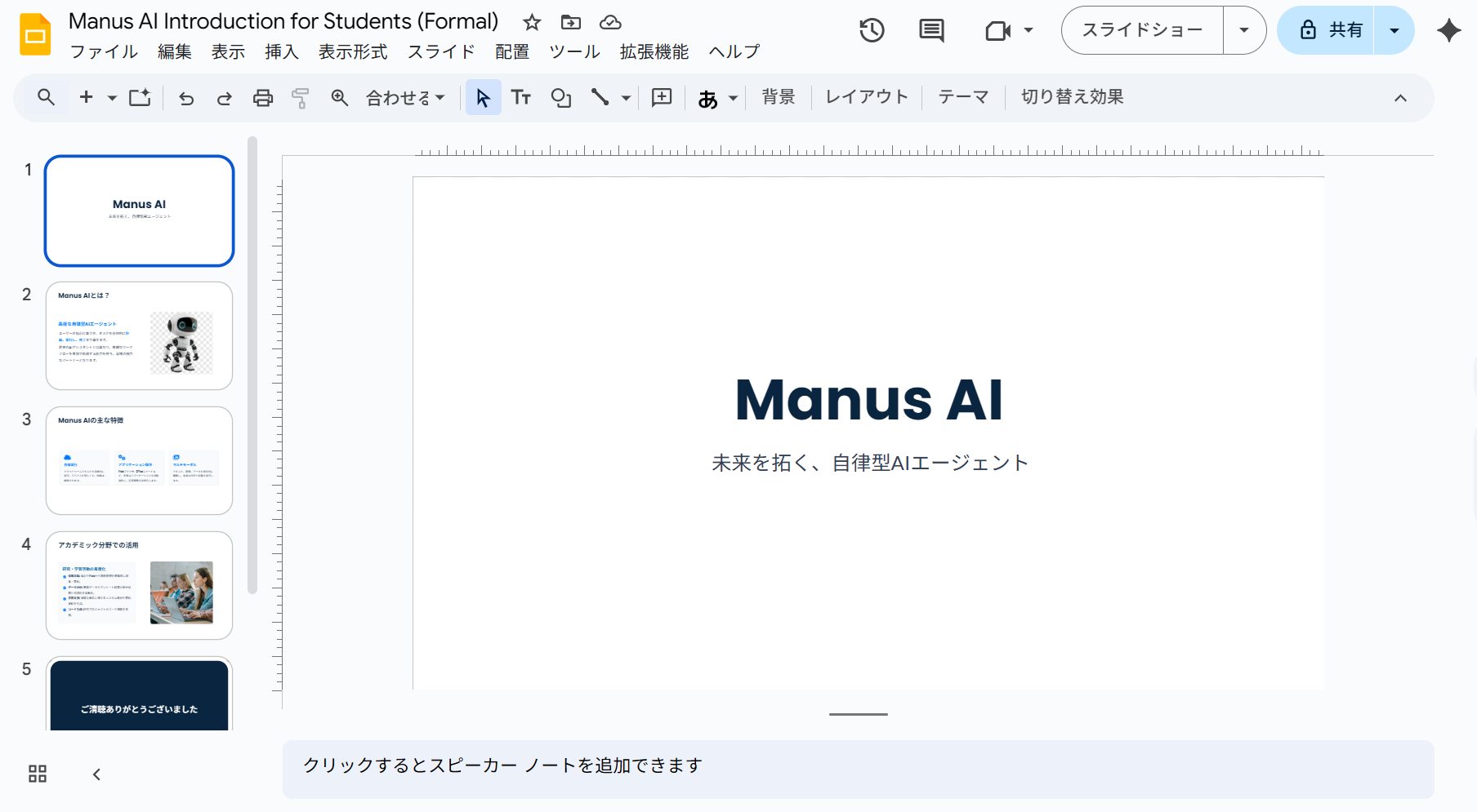Manus aiを紹介する学生向けのスライドを5枚で作って