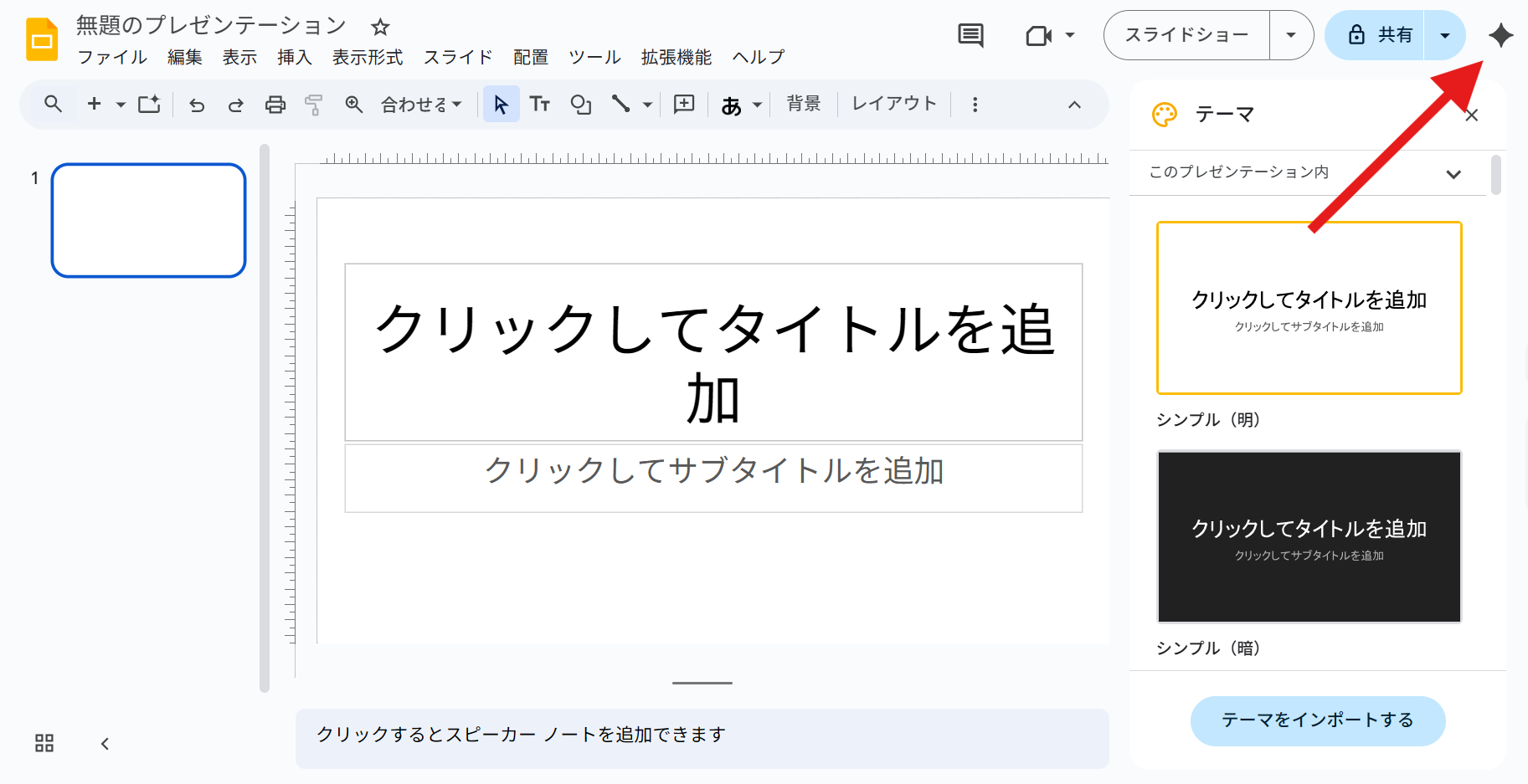 まず、Googleスライドの画面上部、リボンメニューの右側にある「Gemini」アイコンをクリックします。