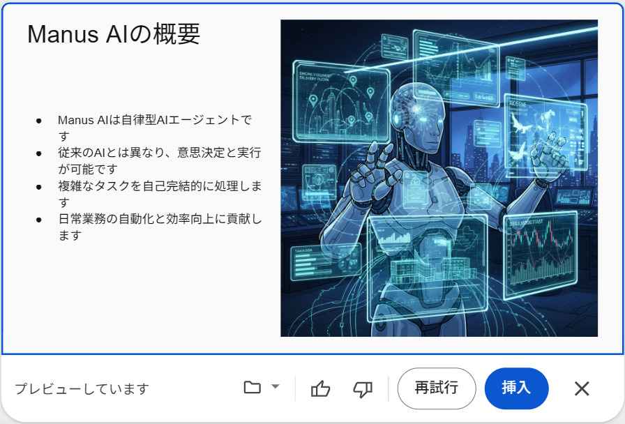 • Googleスライドから直接操作でき、生成後すぐに手動編集に移れる。