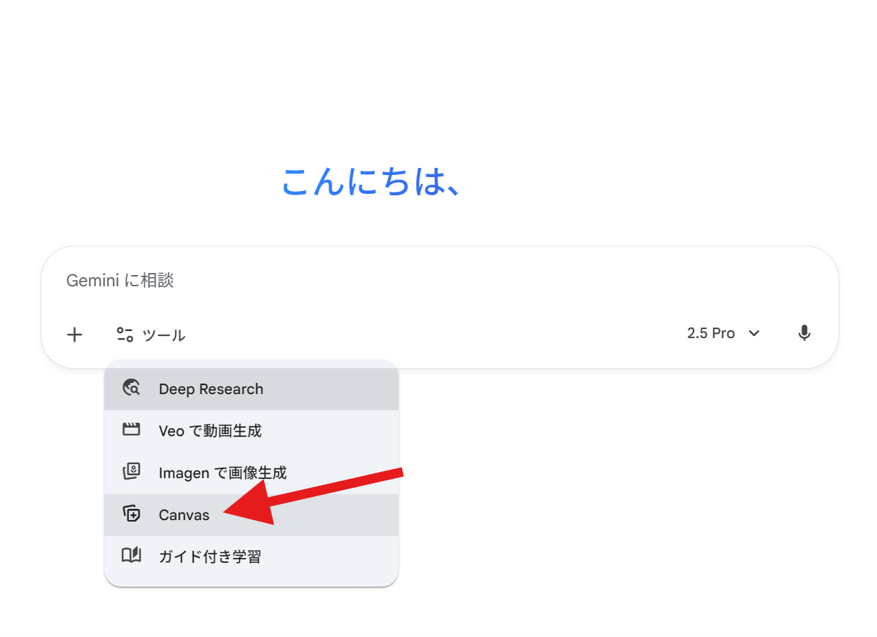まず、通常通りGeminiを起動しCanvas機能をONにしてください。