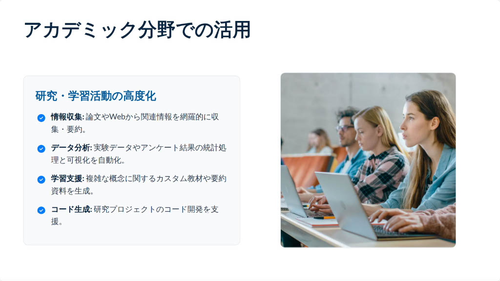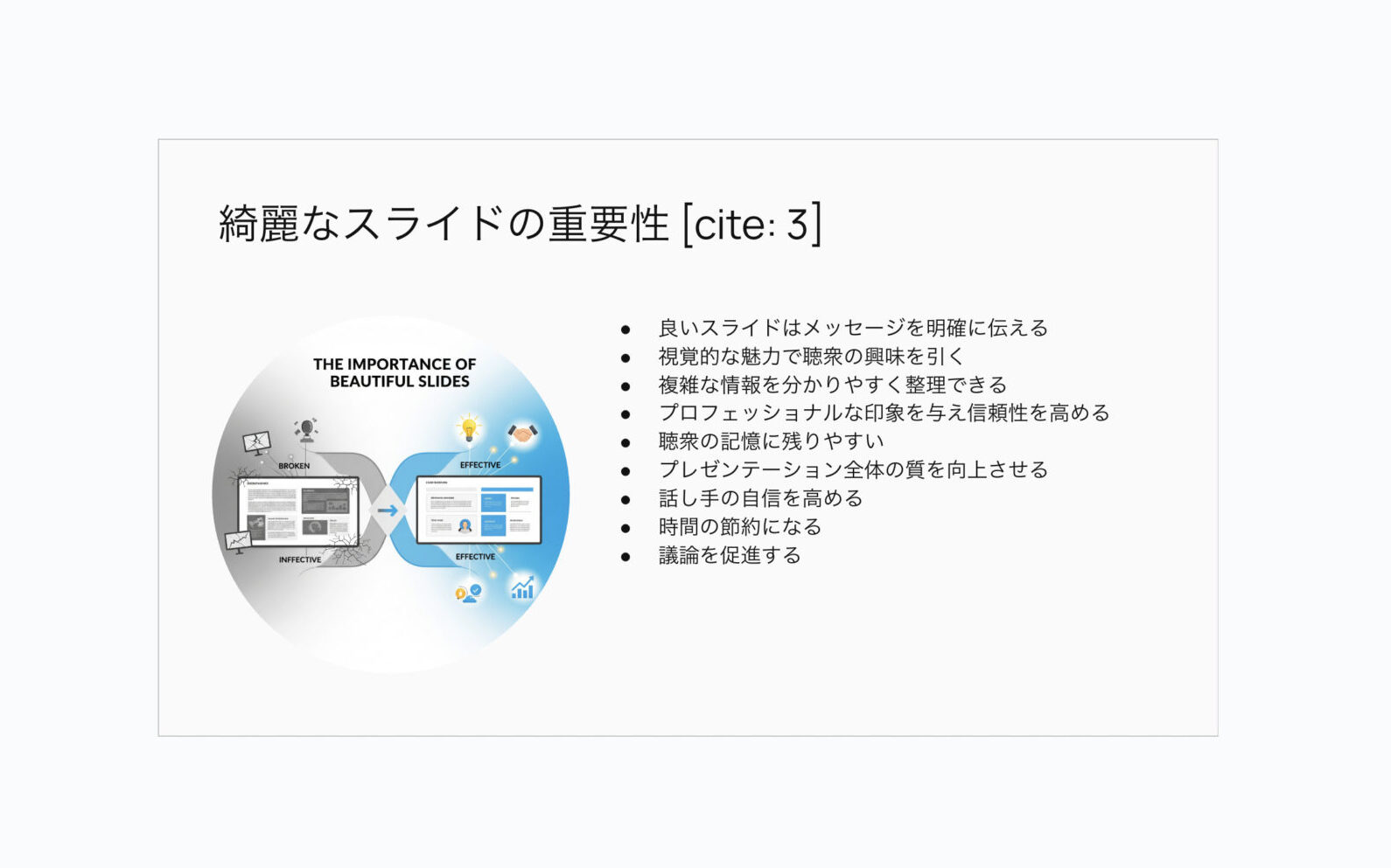 • 複数のスライドを一度に生成でき、デザインと構成の質が高い。