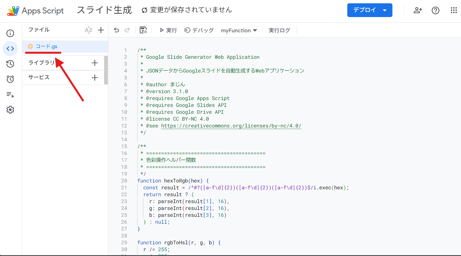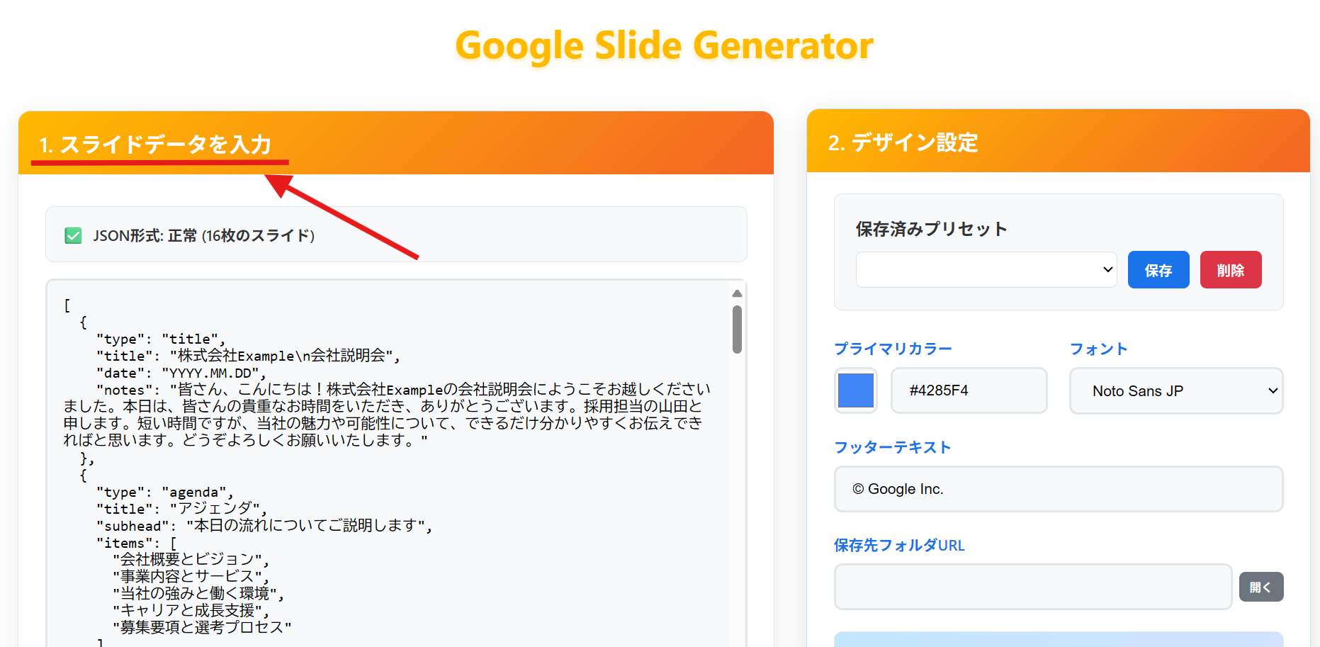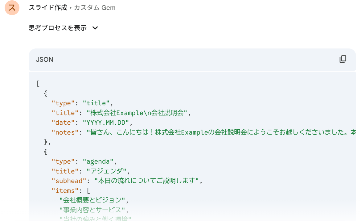 先ほど作ったGASアプリを開き、「スライドデータを入力」という箇所にGemで生成されたコードをコピペします。