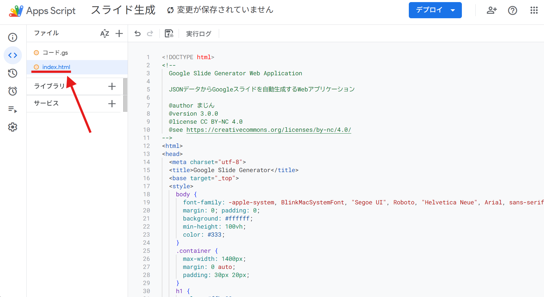 ・左上の+ボタンからHTMLを追加し、名前を「index」にして「index.html.txt」をコピペし、上部バーの保存ボタンを押す。