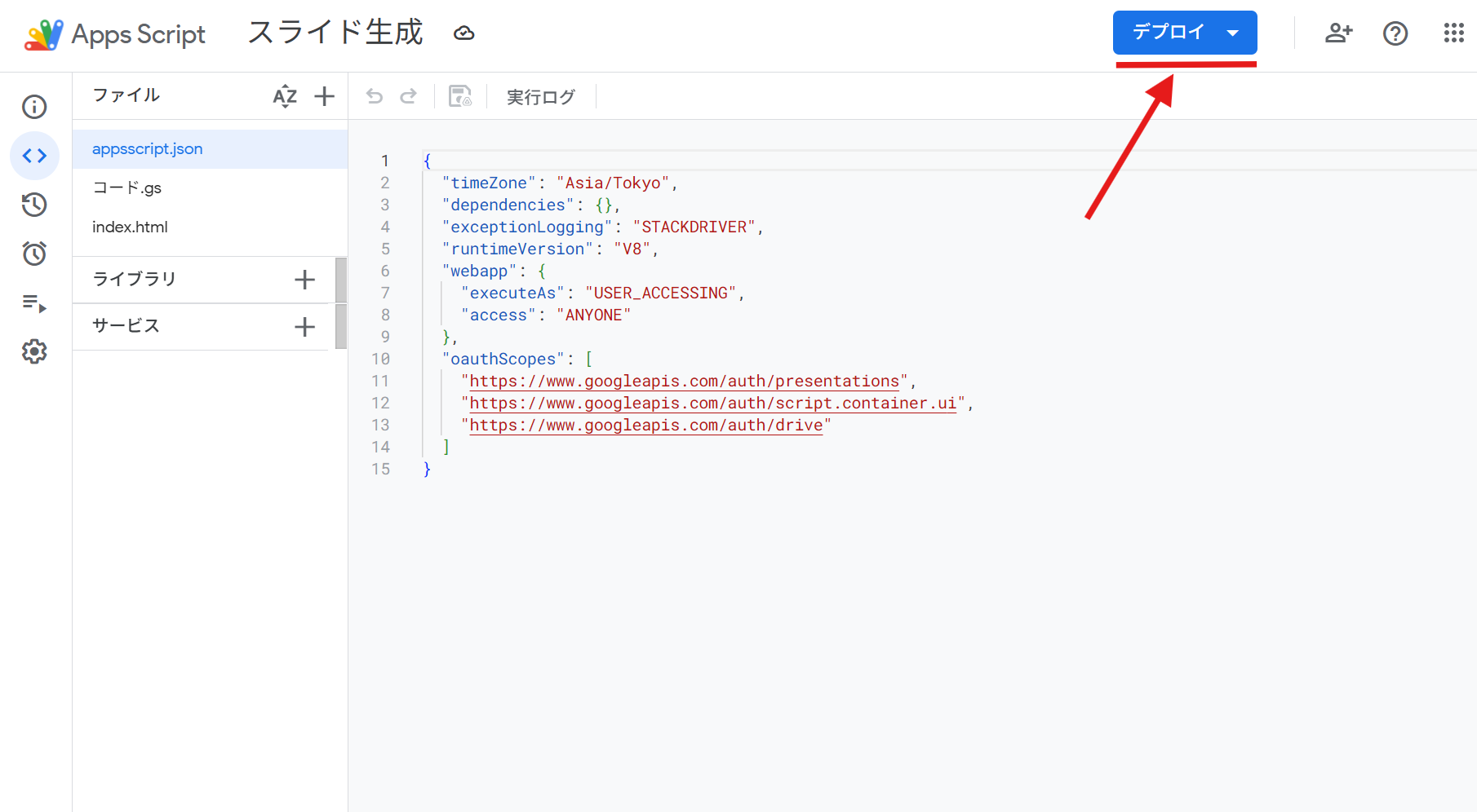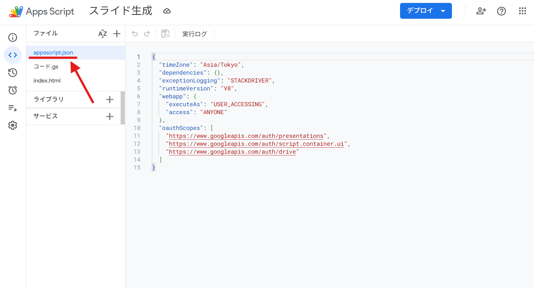 再度エディタ画面に戻るとappsscript.jsonファイルができているのでそこに「appsscript.json.txt」をコピペし上部バーの保存ボタンを押す。