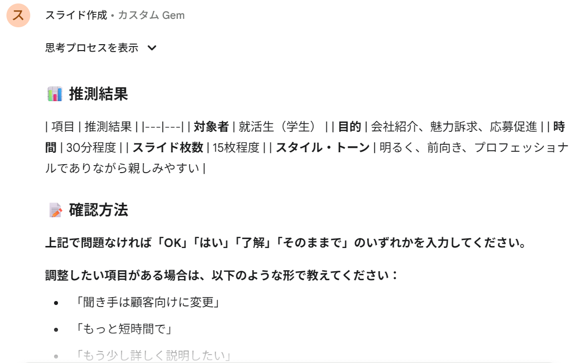 最初に作ったGemにて作りたいスライドの要件を伝えます。