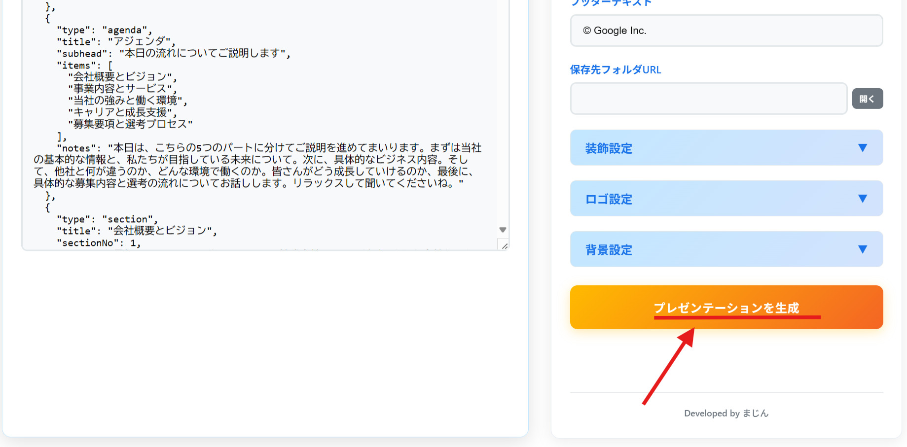 最後に右下の「プレゼンテーションを生成」を押せば完了です。