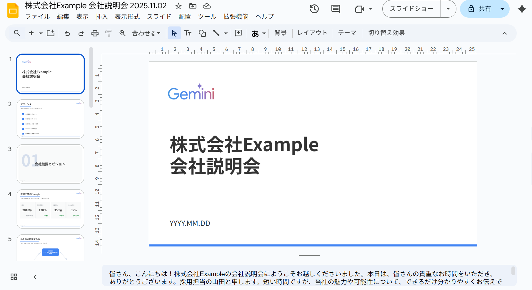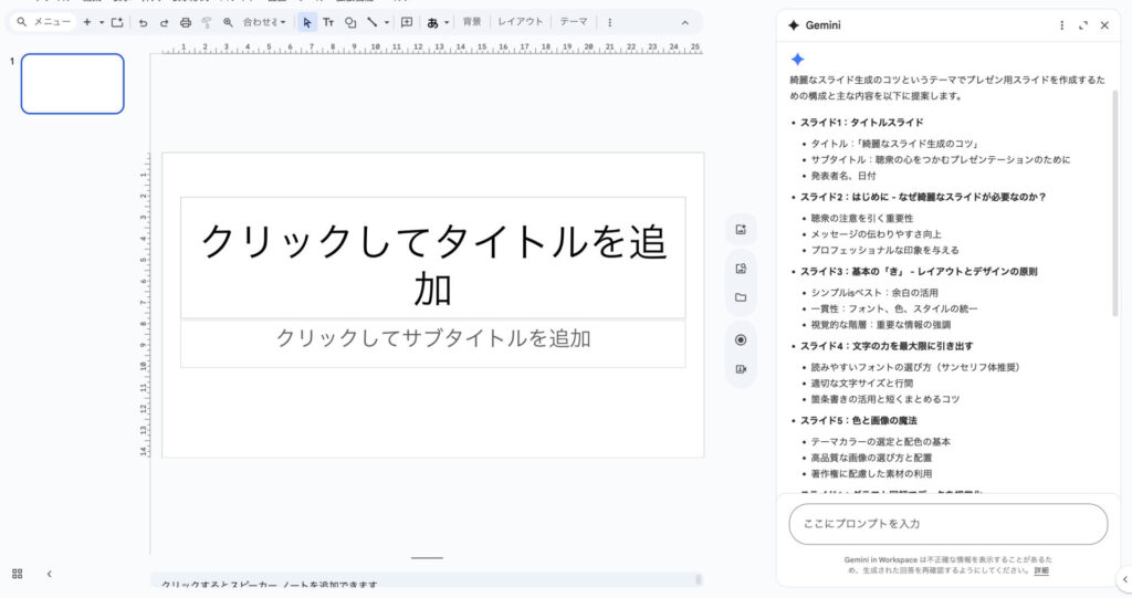 ここではあまり実用的ではない方法としてGemini in Googleスライドの生成例をご紹介します。