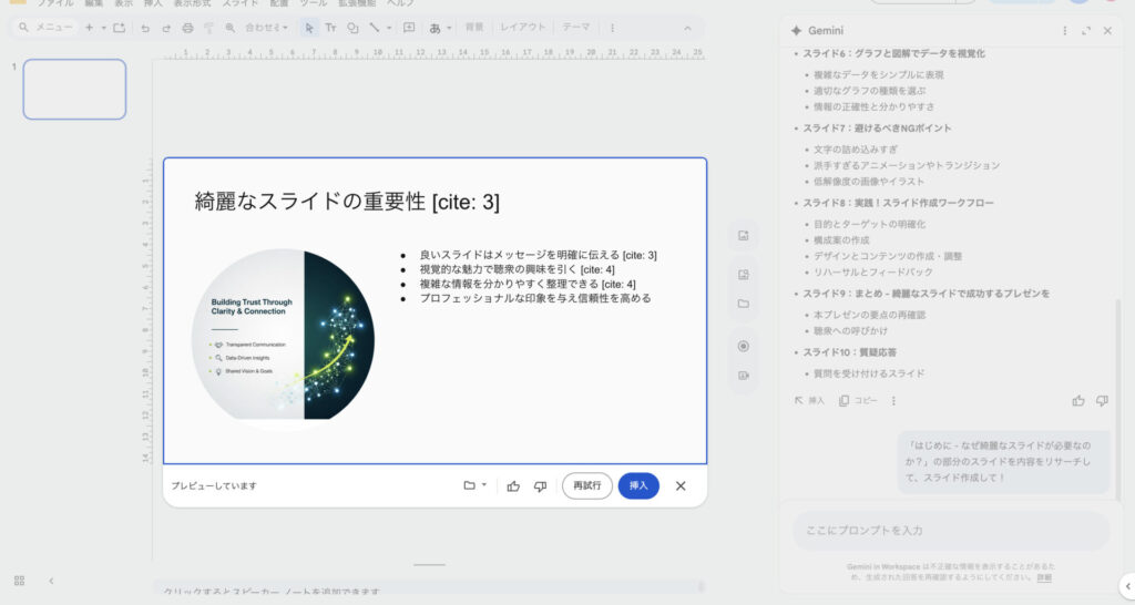 • Gemini in Googleスライドの欠点を補い、質の高いスライド自動生成を実現する方法。