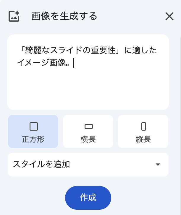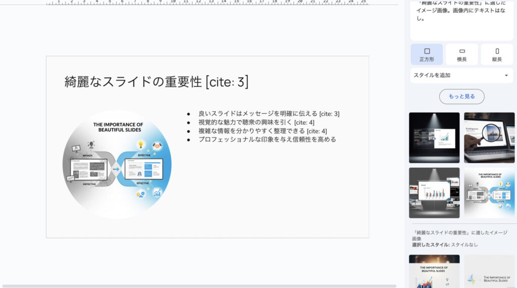 スライド作成をする上で、なんでもいいけどイメージ画像が欲しい、というときはGoogleスライド内の画像生成機能で、「綺麗なスライドの重要性」に適したイメージ画像」と入力するだけで、イメージにあった画像を複数枚生成してくれます。