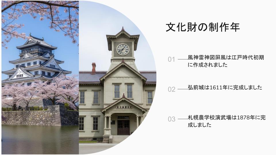 スライドに各文化財の作られた年を説明に加えてください。 ・風神雷神図屛風は江戸時代初期 ・弘前城は1611年に完成 ・札幌農学校演武場は1878年に完成
