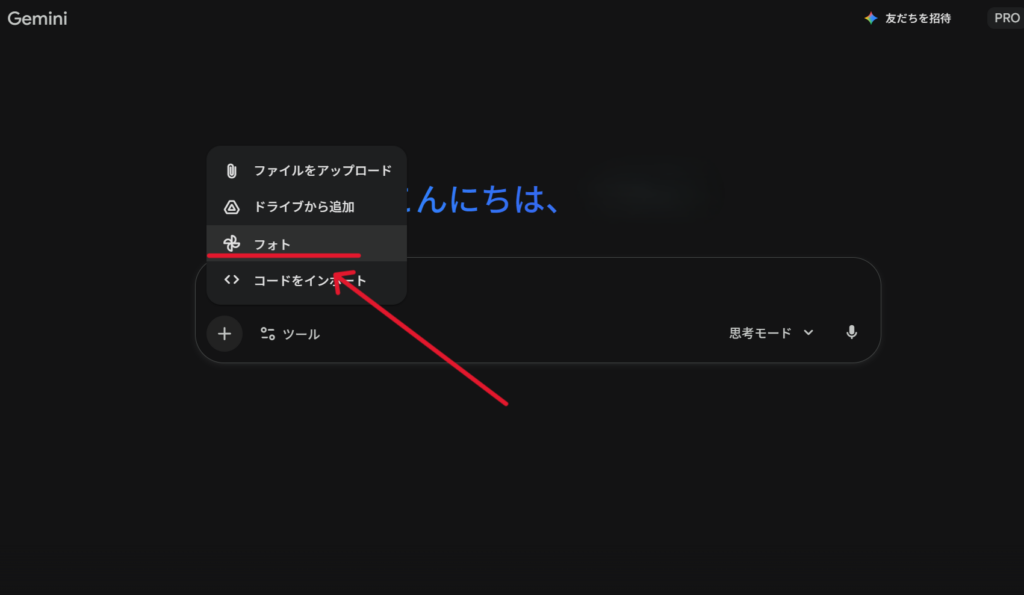 チャット入力欄にある「+」アイコンをクリックし、アップロード形式を選択します。そこから、加工したい写真を選択してアップロードします。