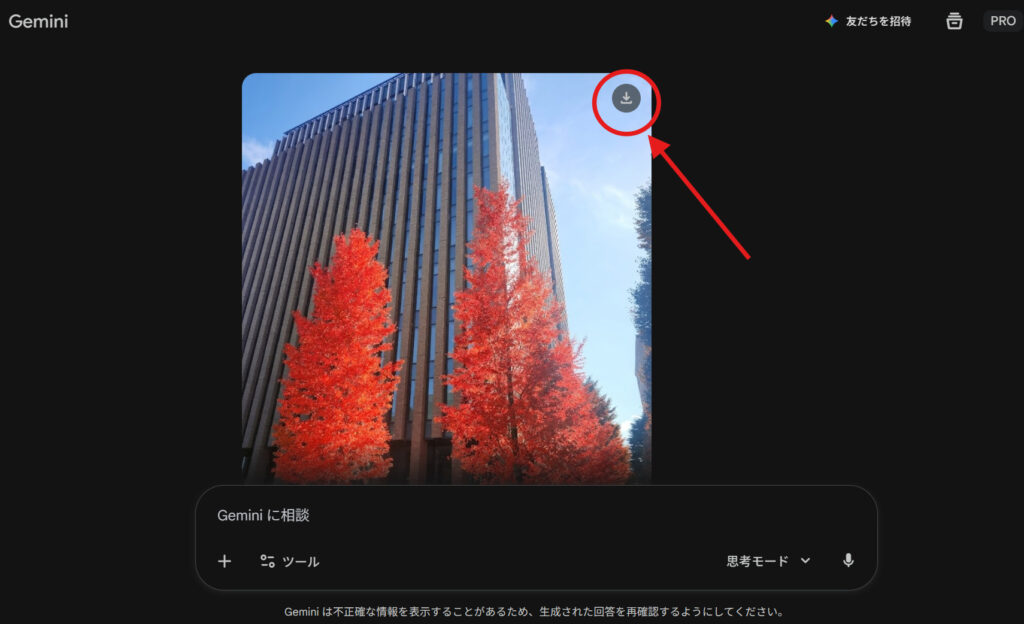 生成された画像をダウンロードする際には、画像右上のダウンロードボタンを押すだけでOKです!