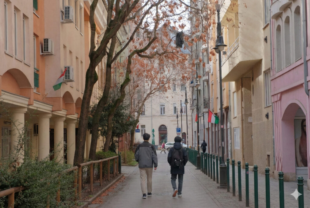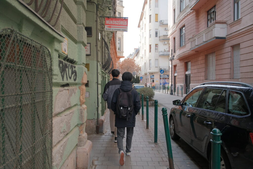 1枚目の写真の中央を歩く2人を2枚目の写真の道路を歩いているように合成して〇元の画像(下2枚)
