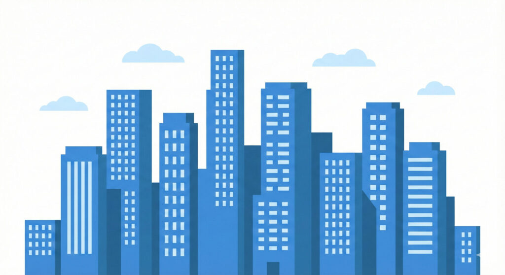 都会の画像を生成してください。画風は以下に従うこと、 A flat design vector illustration. The style is clean, minimalist, and professional, suitable for presentation slides, using simple geometric shapes with no outlines. The background is pure white (#FFFFFF). The color palette is strictly limited to the following hex codes: * Primary Blue: #4A90E2 * Secondary Deeper Blue (for shading and details): #357ABD * Light Accent Blue (for highlights and windows): #E6F0FF〇生成結果