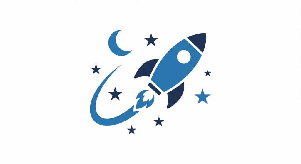 (ロケットが宇宙へ飛び立つ様子)を表すイラスト。ピクトグラムで生成して。背景は白一色。色は企業の信頼感を表す青とネイビーを基調にシンプルにしてください〇生成例
