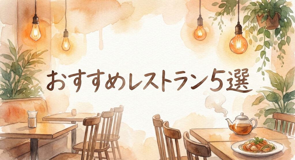(おすすめレストラン5選)という題名が書かれたアイキャッチ画像のイラストを描いてください。スタイルは水彩画風で、温かみのあるオレンジ系の照明を意識して。全体的にリラックスした雰囲気でお願いします〇生成例