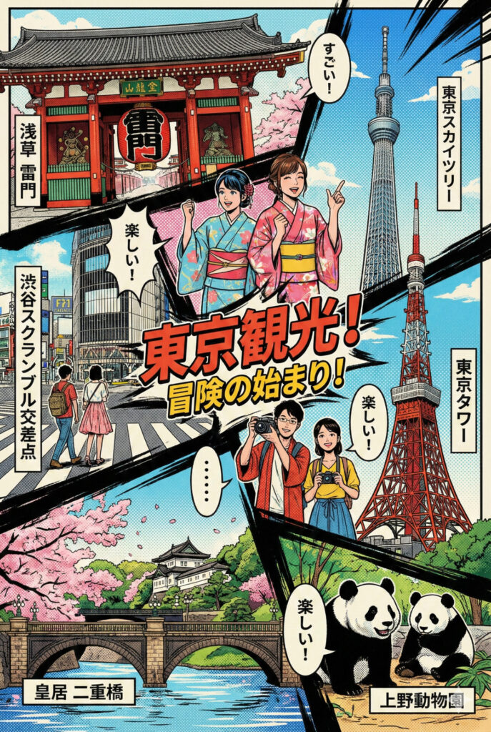東京の観光名所を集めたポスターをマンガ風で生成して〇生成結果