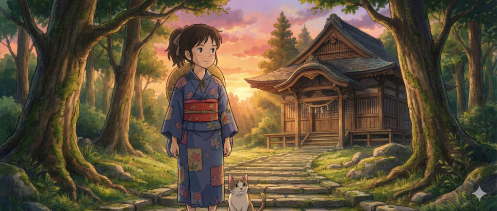 スタジオジブリ風のイラストを描いて。着物を着た少女が立っている状況〇生成例