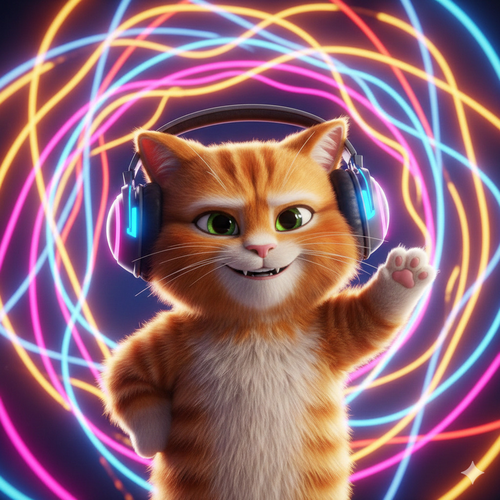 (ヘッドフォンをつけた猫)を3Dアニメーション映画のキャラクター風に描いて。(毛並みはフワフワ)で、表情は自信に満ちた笑顔。背景は鮮やかなネオンカラーの抽象的な模様にしてください〇生成例