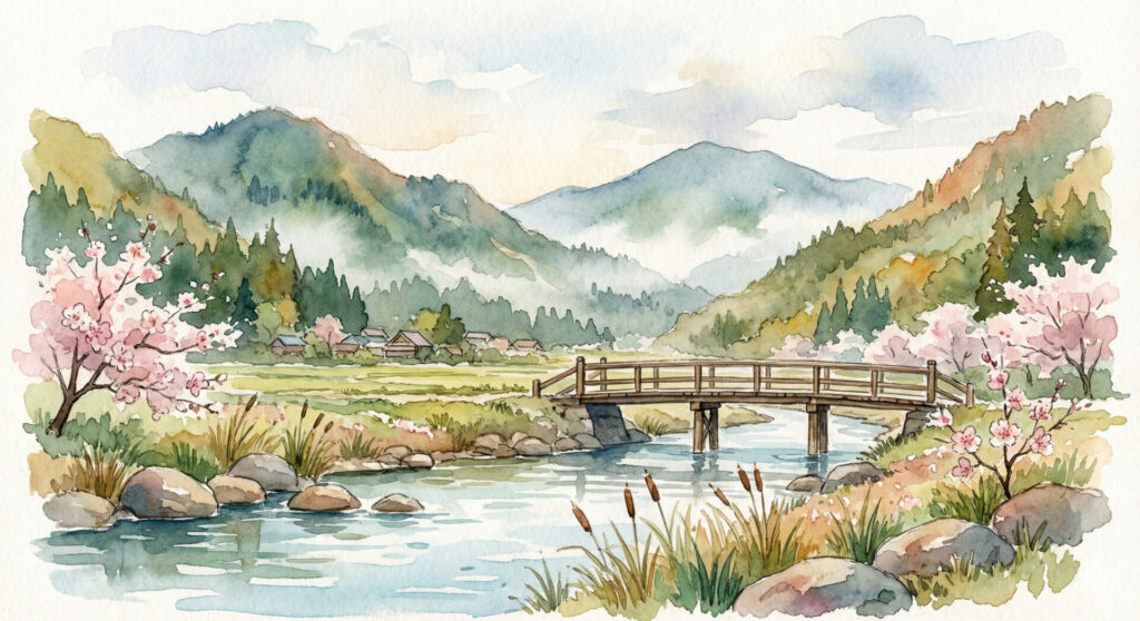 手前に川が流れていて、奥に山がある水彩画風のイラストを生成して〇生成結果