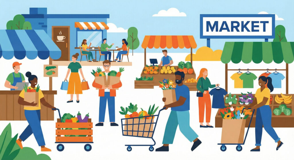 買い物をしているイラストをベクター風で生成して〇生成結果
