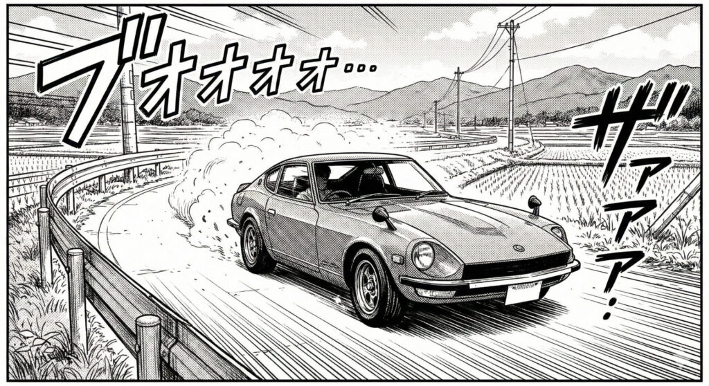 前の画像と同じ画風で、車が走っているシーンのイラストを生成して〇前の画像