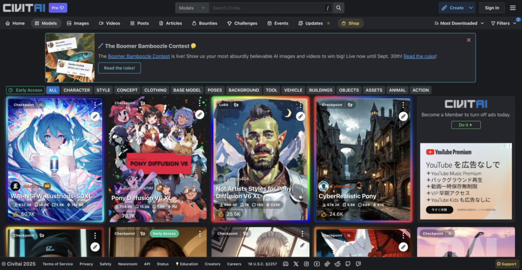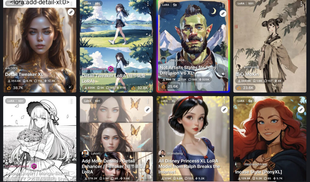 CivitAIは、それぞれのモデルやLoRAの生成画像例がサムネイル表示されていて、自分の好きなものを見つけやすいサイト設計になっています。
