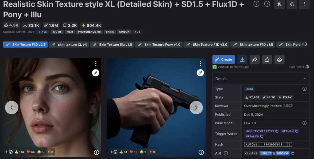 スタイル・画風「LoRA」③:Realistic Skin Texture style XL (Detailed Skin) + SD1.5 + Flux1D + Pony + Illu