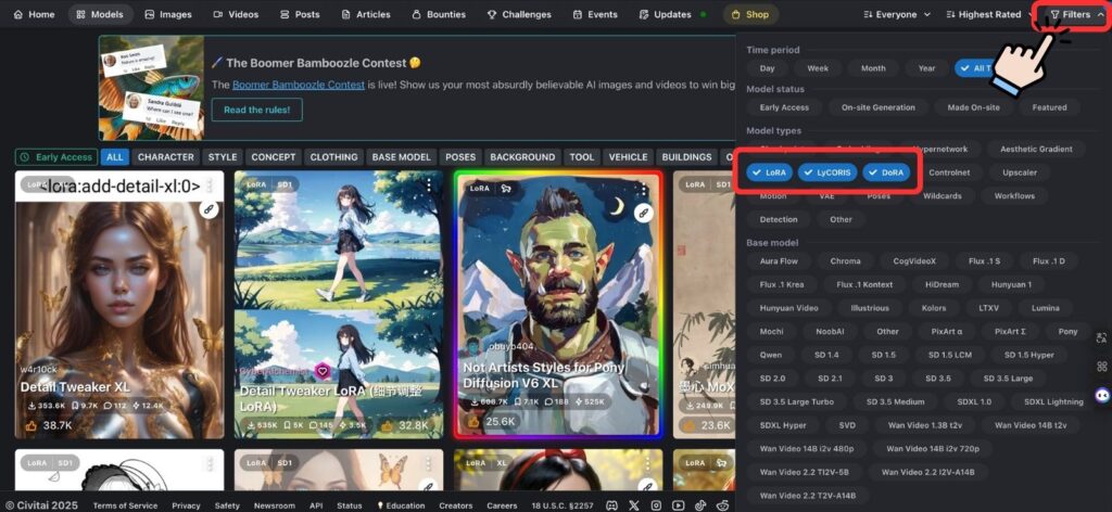 下記の画像のように、『filters』の「LoRA」と「LyCORIS」、「DoRA」にチェックを入れて検索してください。