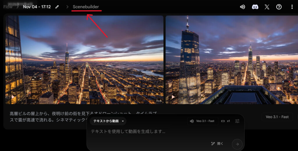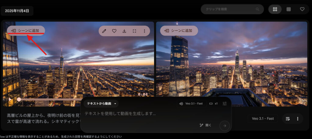 高層ビルの屋上から、夜明け前の街を見下ろすドローンショット。タイムラプスで雲が高速で流れる。シネマティックライティング。 アンビエントノイズ:都会の静かなざわめき。BGM:力強いシンセサイザーのエレクトロニックミュージック。また、Flowには1度に複数のパターンを生成し、その中から気に入ったものを選べる機能があります。今回は1度のプロンプト入力で2パターンが生成されるようにしました。