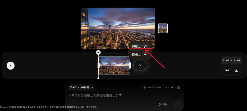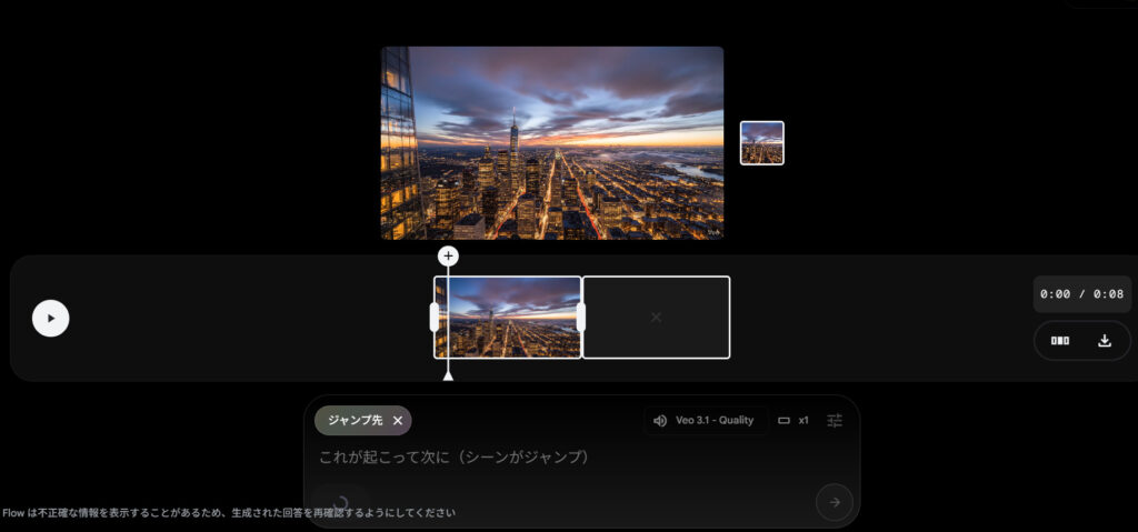 Flowでは1回のプロンプトで最大8秒の動画しか生成できませんが、この機能により複数の動画を組み合わせて長編動画を生成することが可能です!