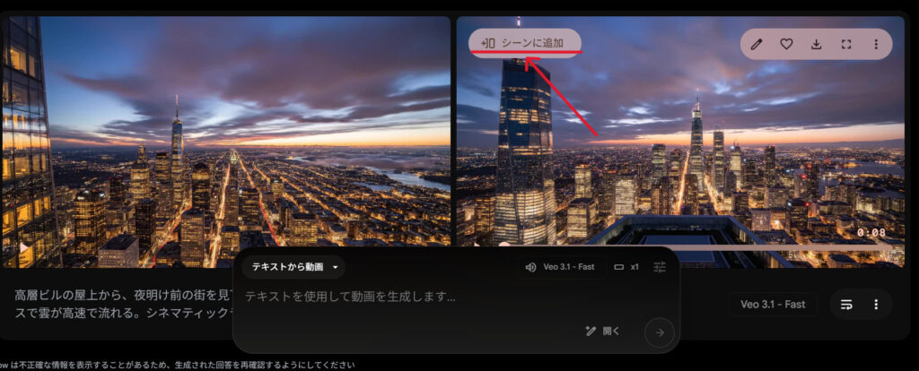 最後に生成された動画で満足できたらシーンに追加または保存します。