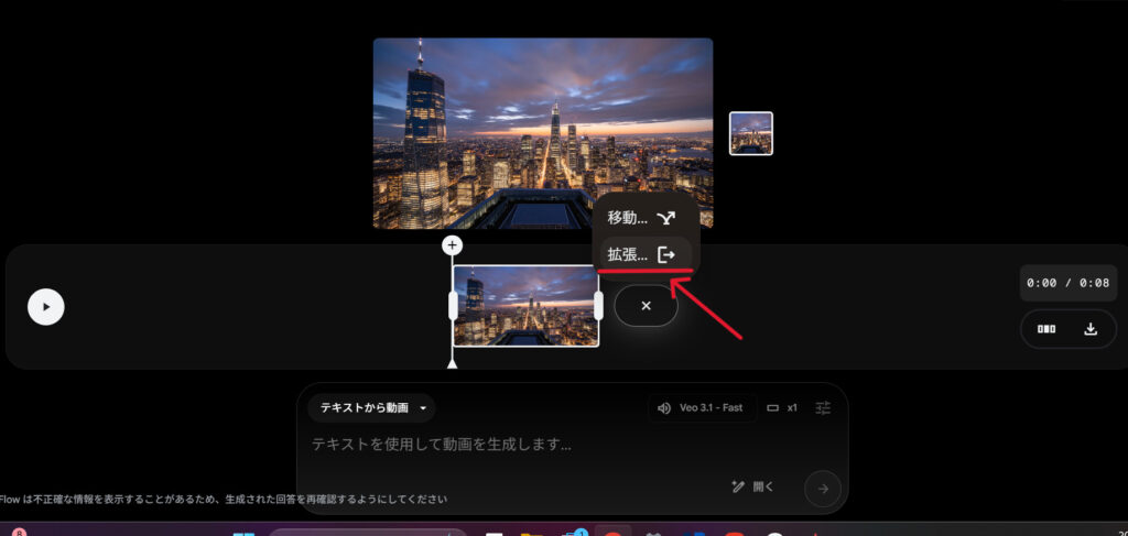 拡張機能を使うと生成した動画の「続き」を自然な形で追加し、クリップを長くできます。この機能を使うことにより同じシーンの動画を作りたいのであれば1回の動画生成で最大8秒という制限を実質解決することができます!