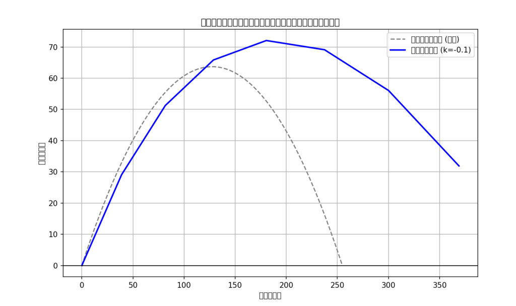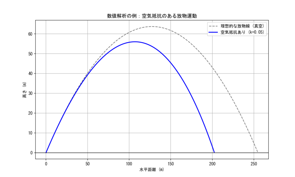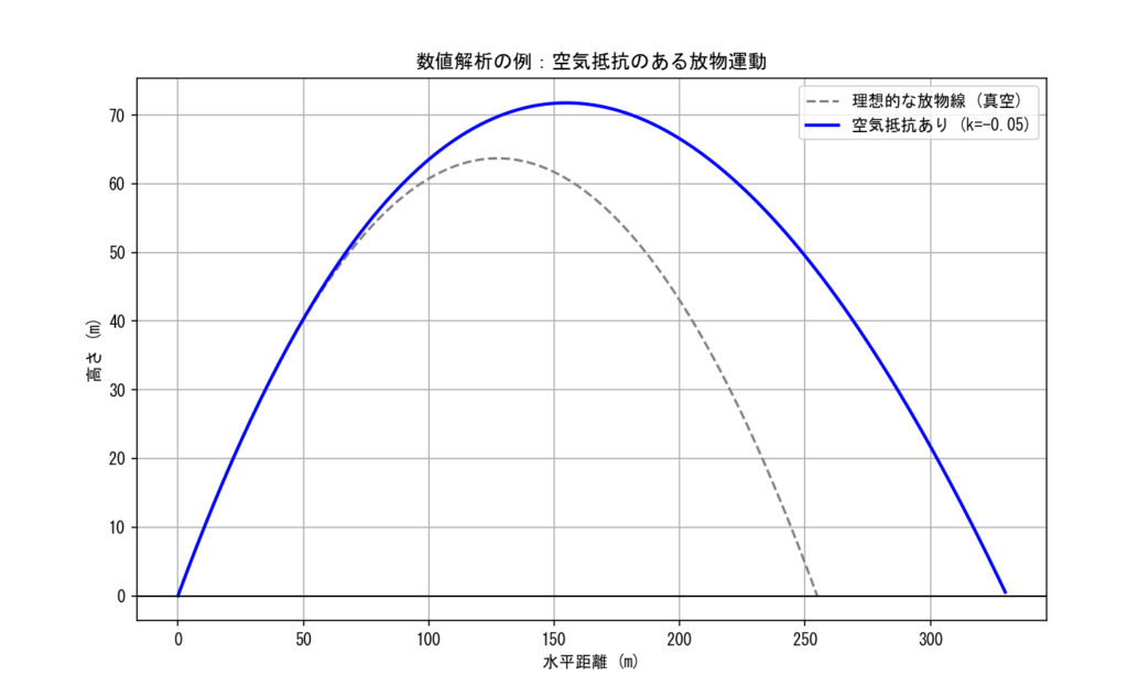 - 空気抵抗がある状態での放物運動と空気抵抗が無い状態(理想状態)での放物運動を観察するための数値解析をPythonで行う