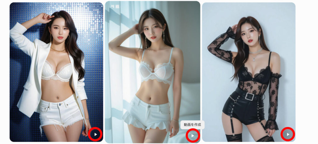 下記のように各画像の右下のボタンを押すことで、動画が30秒~1分程度で生成されます。ここでは、まだSpicyなどの選択はできません。