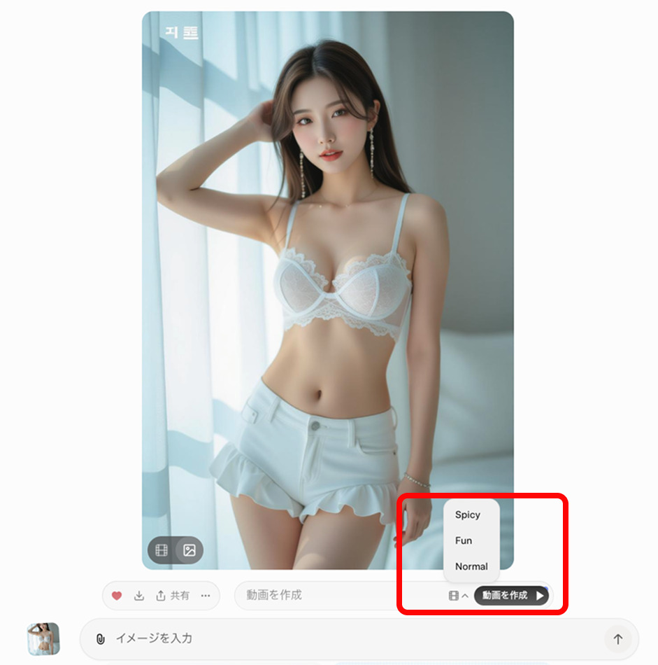 - Grok Imagineは直感的で誰もが使いやすいだけでなく、SpicyモードにでNSFW(エロ)コンテンツをサポートしていて、他のAIより柔軟!