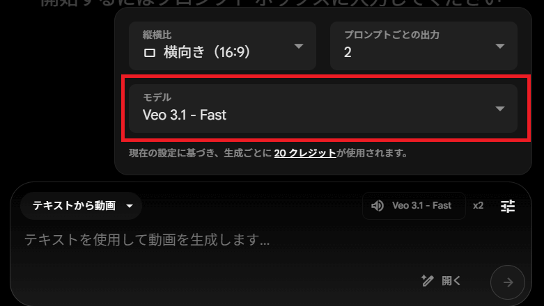 - ステップ3品質設定で「Veo 3.1 Fast」を選択