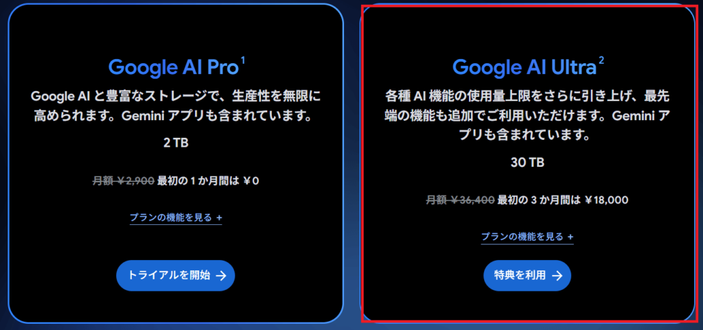 ②Google AI Ultraプラン(月額36,400円):本格的な動画生成をしたい方向けのプロプランです。