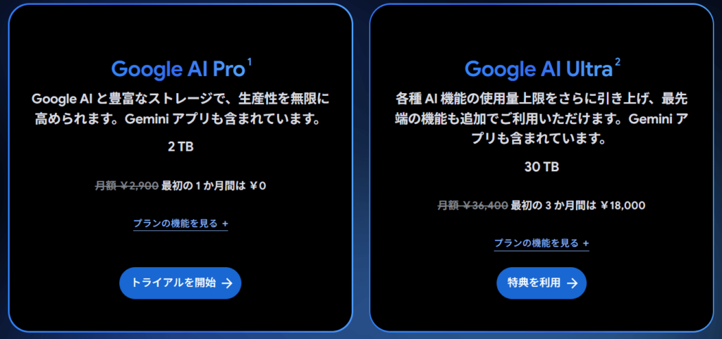 ①Google AI Proプラン(月額2,900円):比較的手軽に始められるエントリープランです。